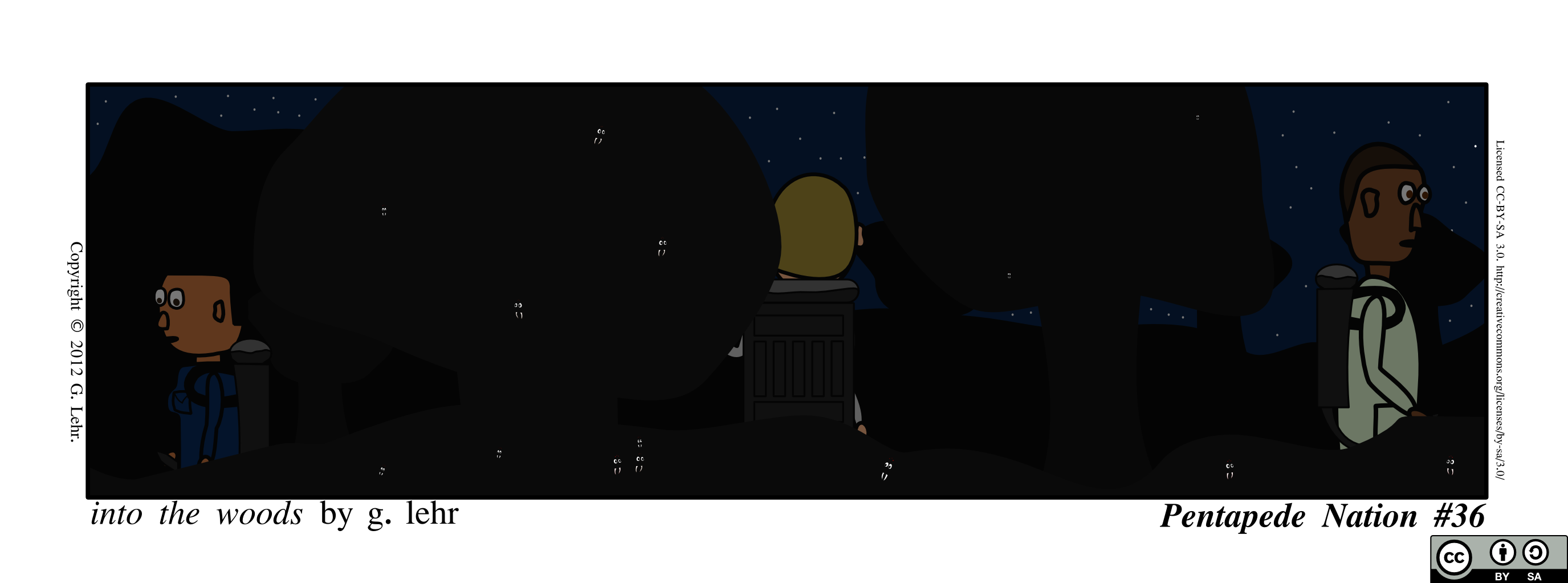 Pentapede Nation Page “into the woods - Pentapede Nation #36” — Posted by G. Lehr, 2012-11-22 — Tags: heshla, ian allgood, kashsh, ligasha, logan samuelson, shishakh, sylvia, ynda, book 1 - escape — Metadata (YAML) — Transcript (TXT) — Permalink