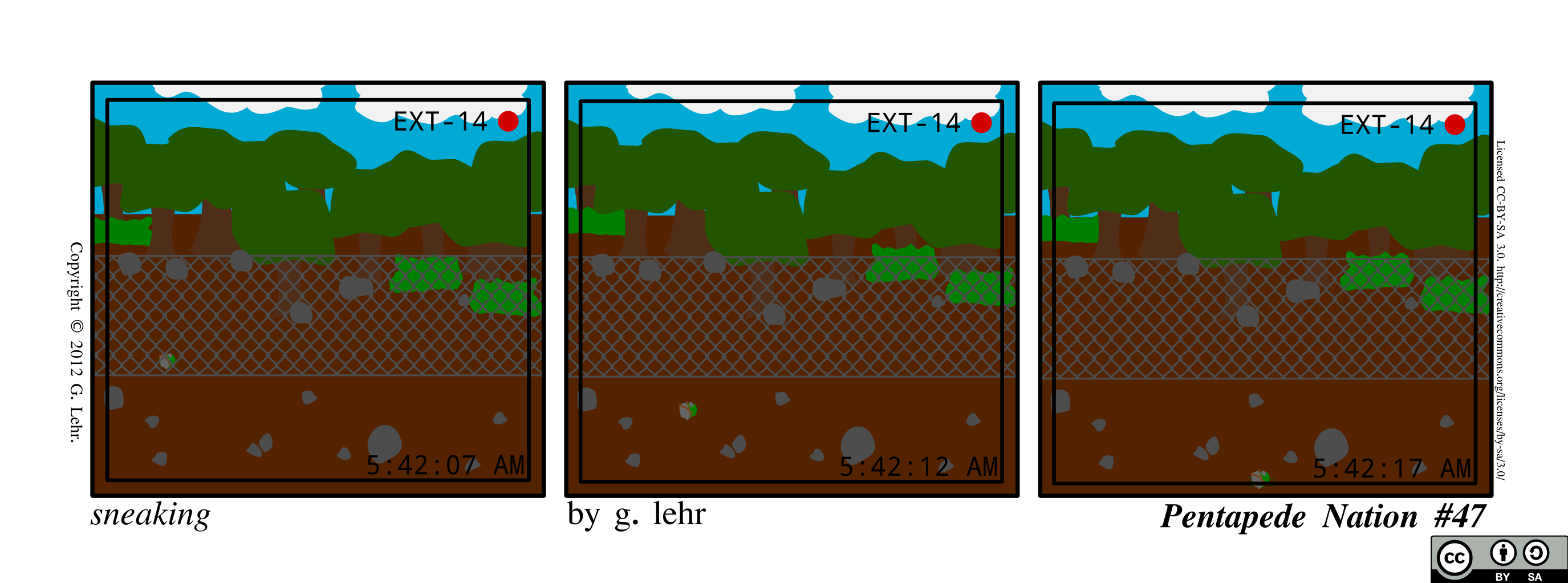 Pentapede Nation Page “sneaking - Pentapede Nation #47” — Posted by G. Lehr, 2013-01-01 — Tags: heshla, book 1 - escape — Metadata (YAML) — Transcript (TXT) — Permalink