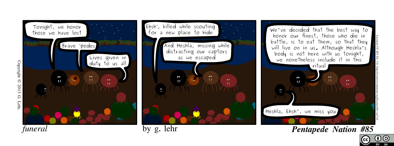 Pentapede Nation Page “funeral - Pentapede Nation #85” — Posted by G. Lehr, 2013-05-14 — Tags: dakra, ehsh', kashsh, ligasha, nokh, shishakh, tasha, ynda, book 1 - escape — Metadata (YAML) — Transcript (TXT) — Permalink